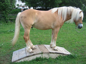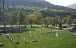 Abwechslung, Spiel und Spaß finden Ross und Reiter im eingezäunten Geschicklichkeits-Parcours mit weichem Wiesen Boden.