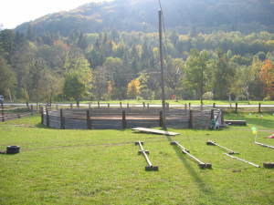 Das mit Holz eingezäunte Round-Pen mit 20m Durchmesser ist wichtiger Bestandteil in der Pferdeausbildung.