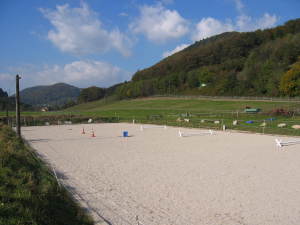 Unser großzügig angelegter Sand - Reitplatz mit den Maßen 20x60m ist gut drainagiert und lädt auch nach starkem Regen zum reiten ein