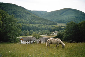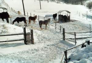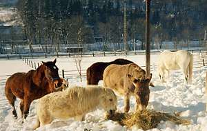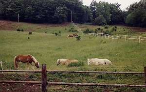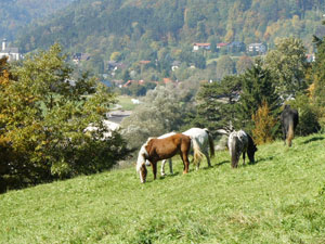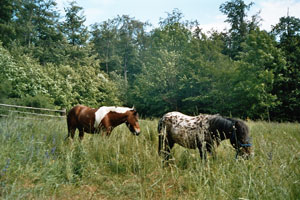 Auf insgesamt 40ha Naturweiden, eingezäunt in grosse Wald- und Wiesenkoppeln verbringen die Pferde den Sommer.